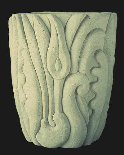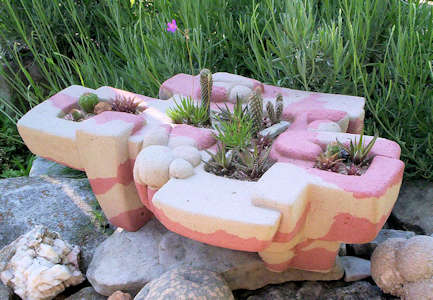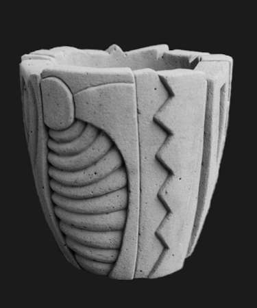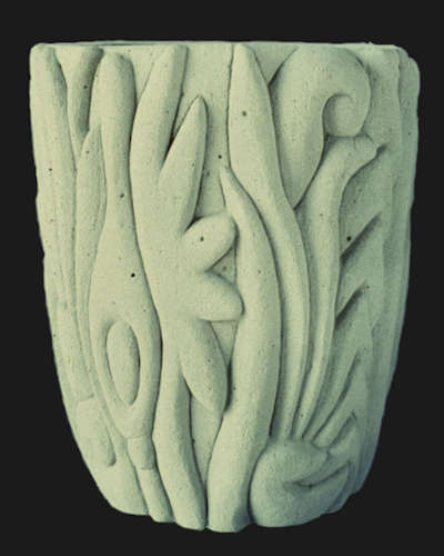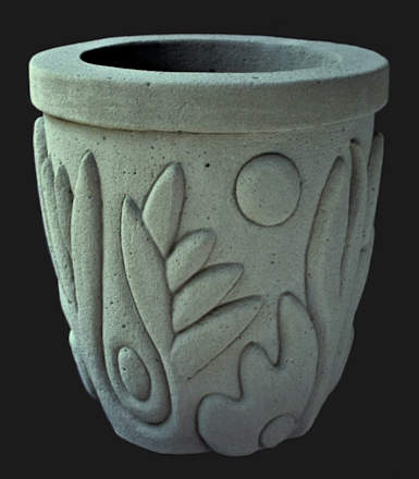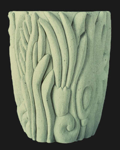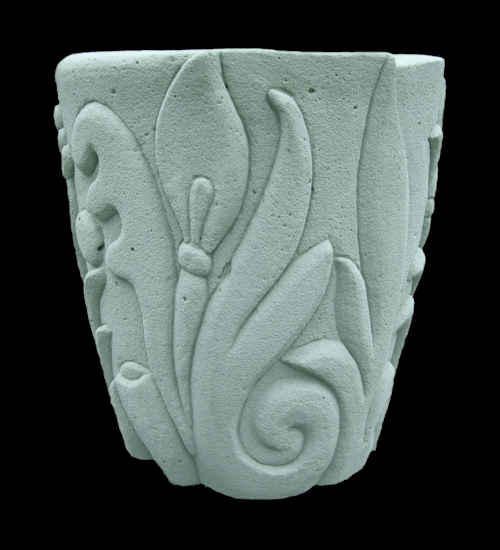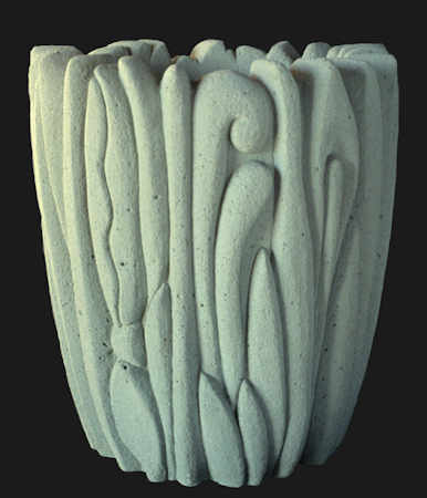 With wet carved concrete planters have always been central to my creative process. Wheather flat or curved, large or small the vertical surface allows most anything that the imagination can conceive to be patiently rendered. Early on the titles of the pieces were always descriptive and through the years that has enabled me to keep up with what was what. |