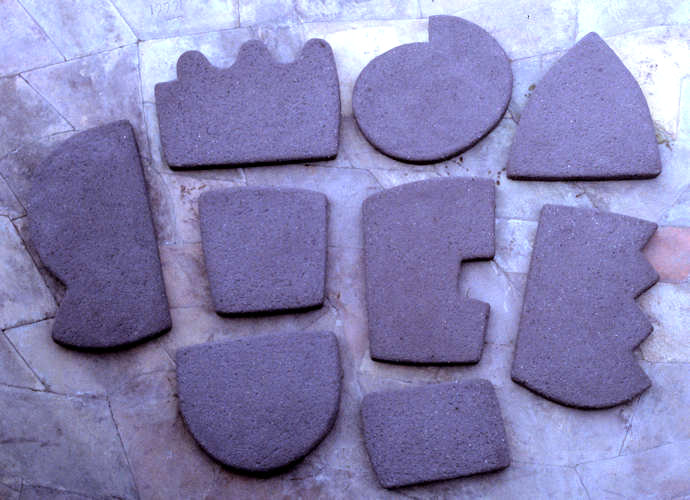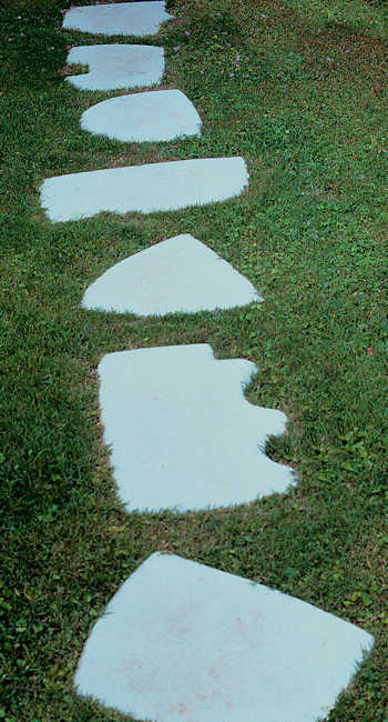 Stepping stones are easy to make. The forms are simple and usually do not require much mix. I started making steps to offer lower priced items at craft fairs. The Hearts were the best selling steps and I made small, medium and large sizes. Larger Garden Stones were added, followed by Puzzle, Leaf, and Abstract Step sets. The need for steps that stayed put led to the Big Step sets. |